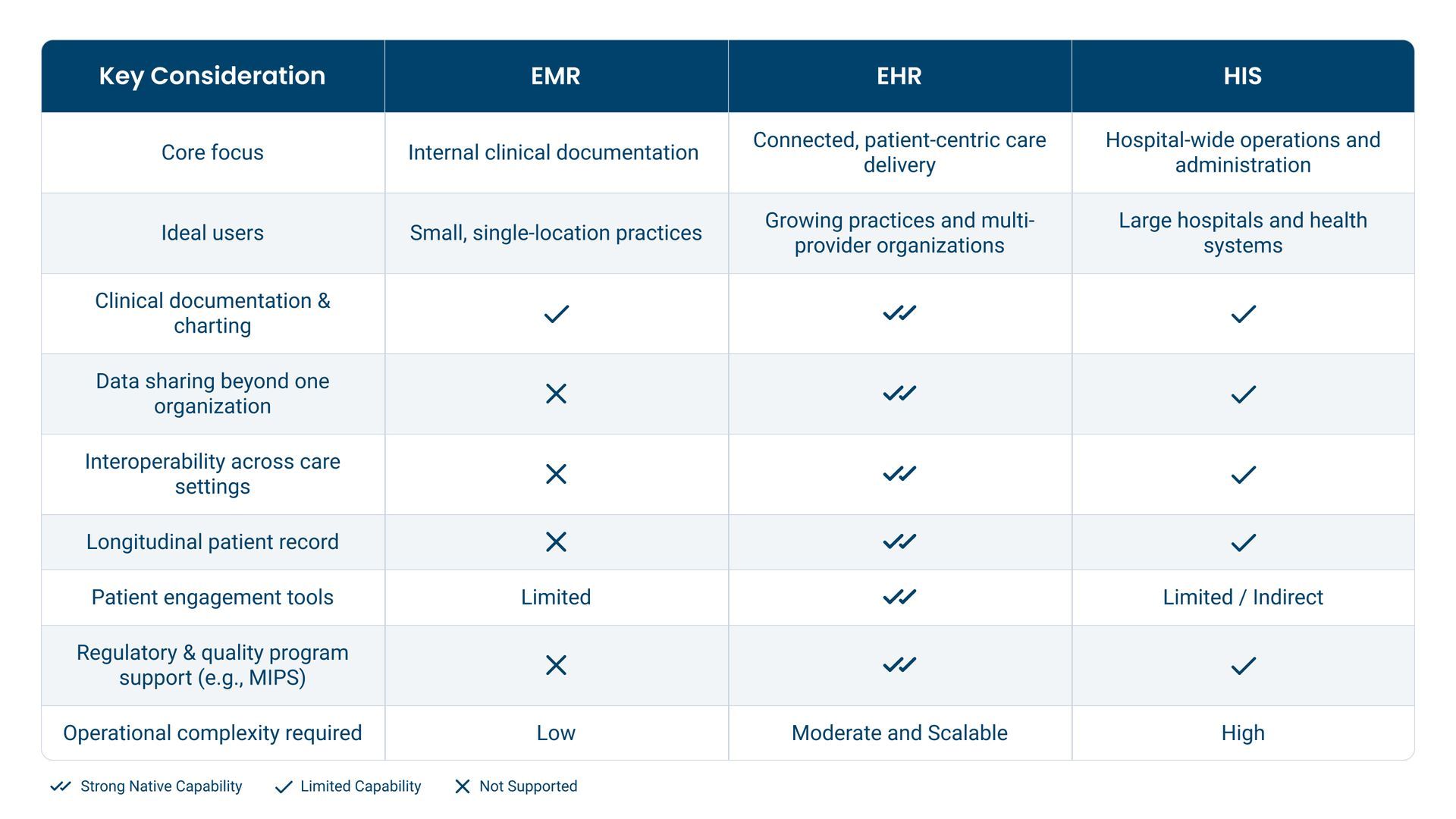 Smaller practices begin with EMR systems, while larger practices and healthcare systems begin using EHR systems to enhance collaboration and scalability, while hospitals continue to use HIS systems in combination with EHR systems to manage their complex functional needs.